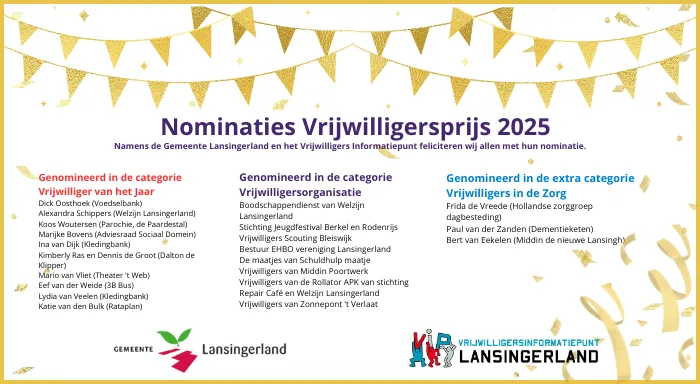 Namens de Gemeente Lansingerland en het Vrijwilligers Informatiepunt feliciteren wij allen met hun nominatie.